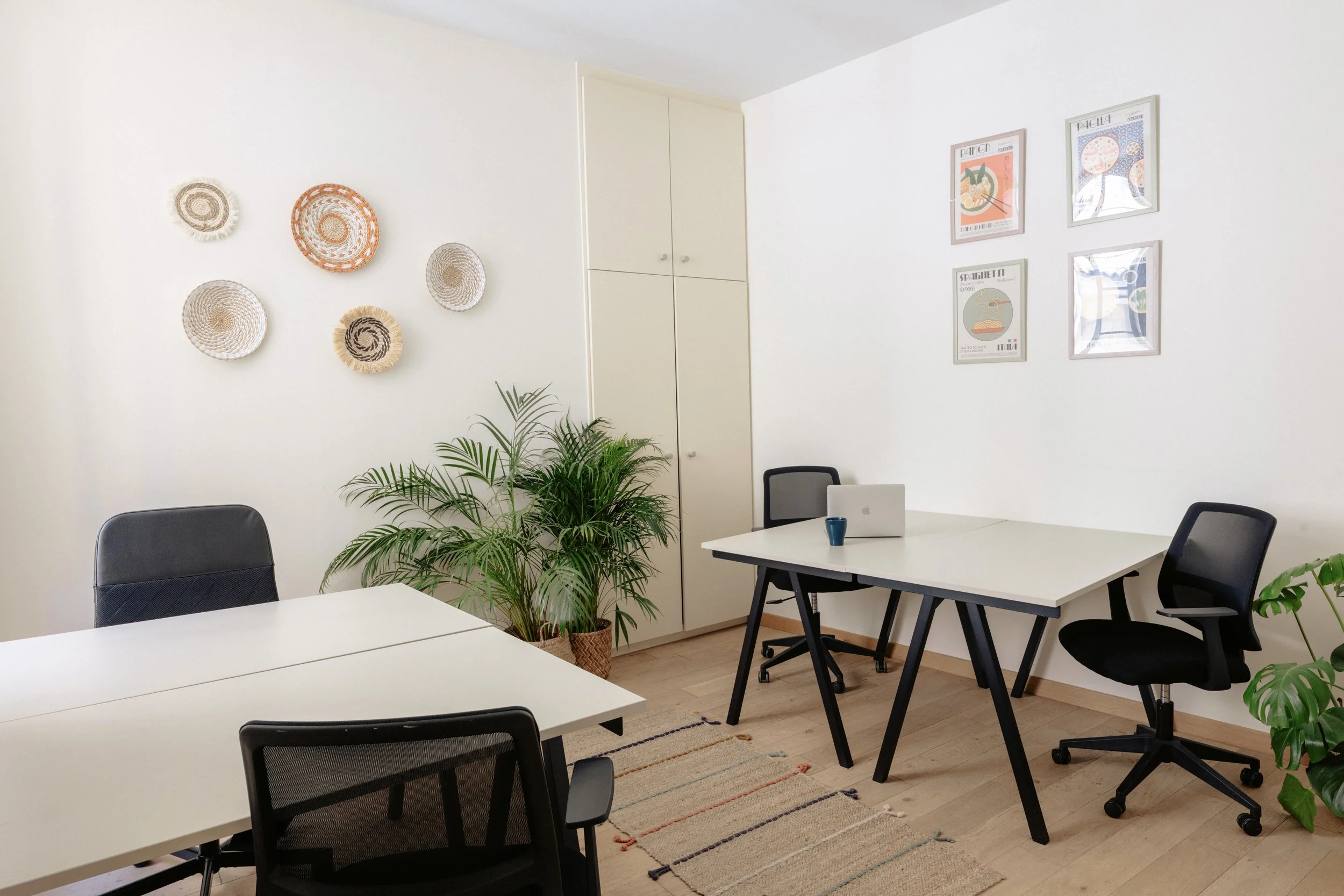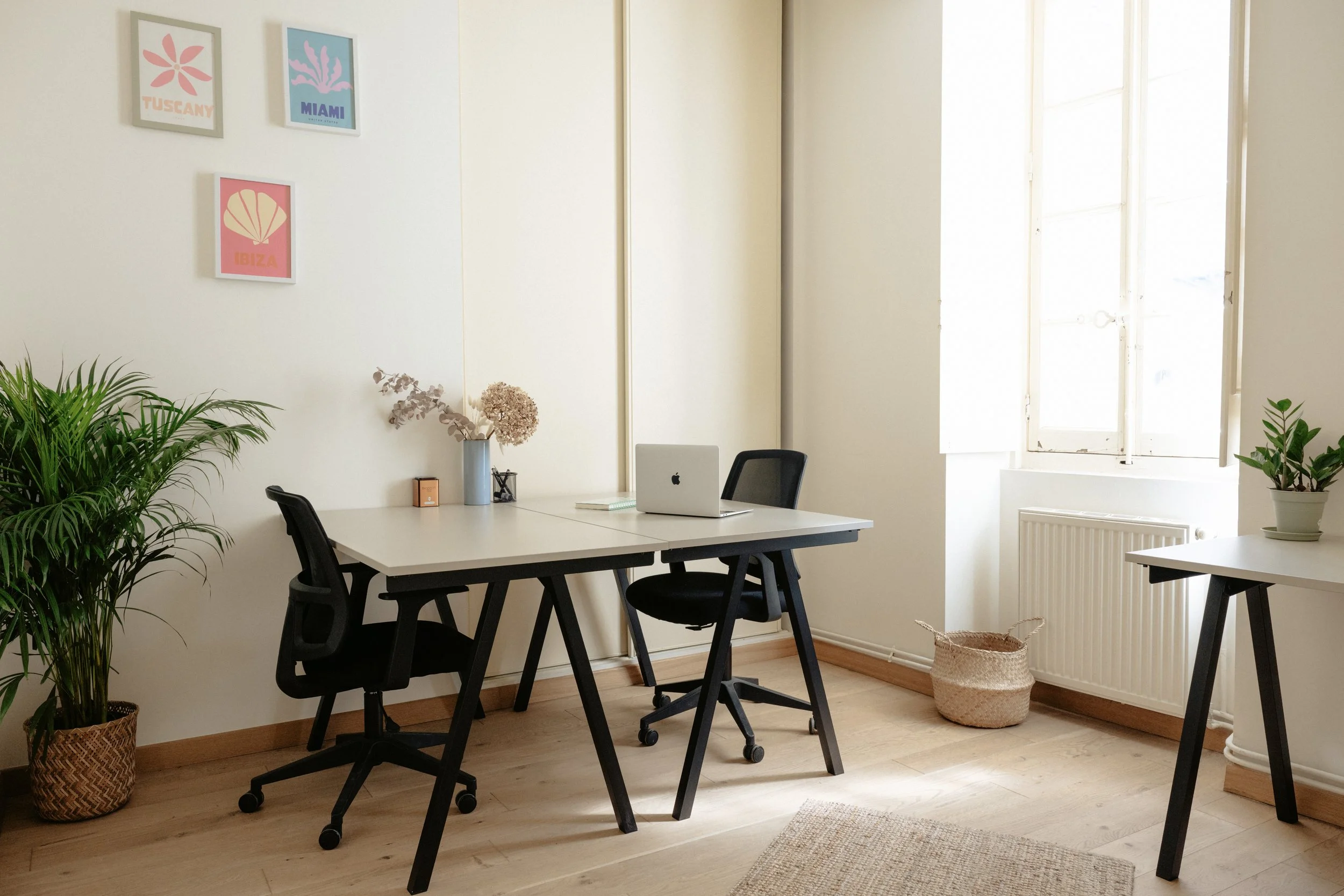 Juliette la “lumineuse”. Le bureau Juliette est baigné de lumière avec ses deux fenêtres donnant sur l’impasse piétonne. Fonctionnel avec son grand placard, il est extrèmement agréable pour deux personnes.